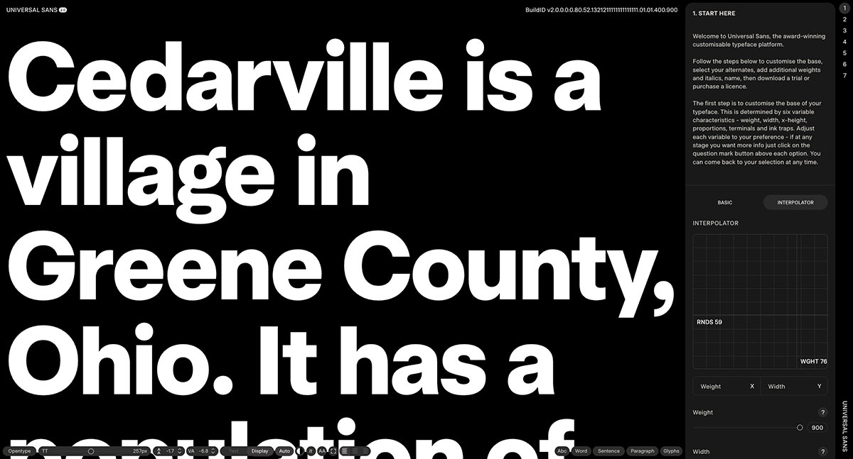Daniel recently clued me in to Universal Sans; a highly customizable typeface complete with web interface to dial in your specifics. You set everything from the x-height to the ink trap style to the punctuation style to make it your own. There are certainly some limitations - you aren't drawing a typeface from scratch! - but it's a very nice way to make a unique look within some very respectable confines.