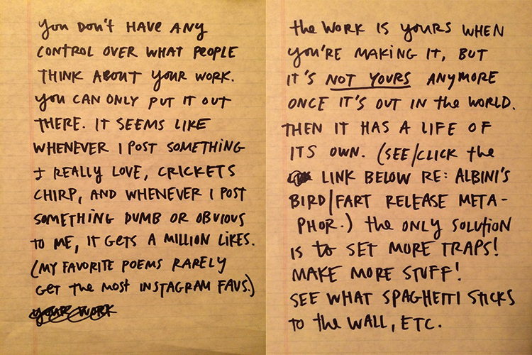 I'm a big fan of Austin Kleon. Period. His art is interesting, his books are fascinating and his insight into art is both simple and worthy of note. This hand scrawled note about the preciousness of art may seem obvious on the surface but it's often hard to remember when you're working on something and feeling quite precious about it.