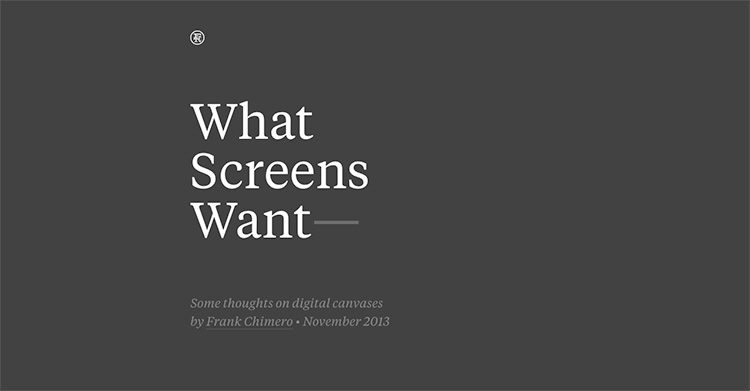 Right before bed last night I pulled up this transcription from Frank Chimero's Build 2013 talk, What Screens Want, thinking that I'd just skim it and read it more in depth in the morning. However, the further along I got, the more engaged I became. If you're a designer, it's an absolute Must Read; Chimero is obviously an eloquent mind in the world of design and this piece campaigns for smarter, interactive designs.