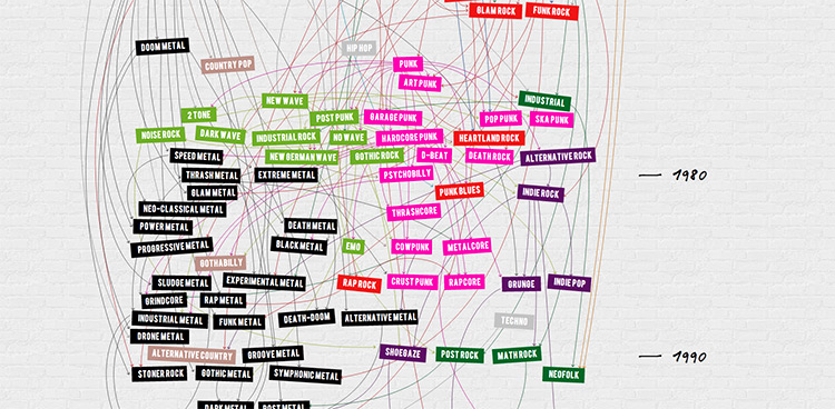 This 100 Years of Rock genre flowchart is absolutely mindboggling. It's impressive for a myriad of reasons - the design, the sheer onslaught of data, the fact that all labels are clickable for examples and, mostly, that it's actually incomplete because there are so many insane subgenres not even slightly represented. Moral of the story: post 1960, genre's went completely bonkers.