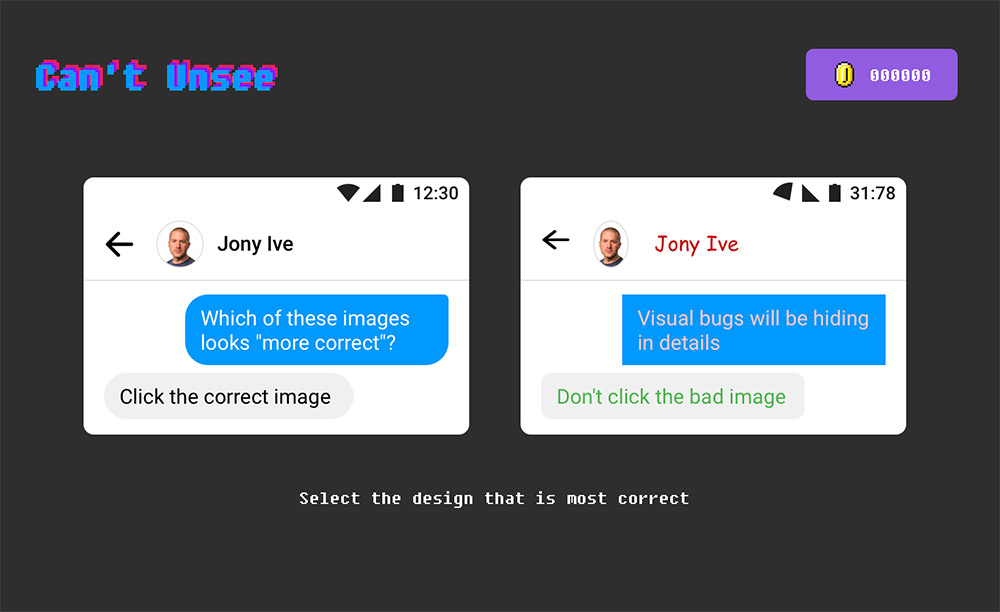 The comparison game of Can't Unsee requires a great attention to detail. If you're the sort of person that is capable of noticing differing line-heights, vague opacity differences or inconsistent rounded corners - this is the game for you!