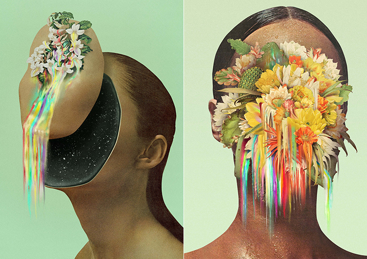 German artist Pierre Schmidt, aka Dromsjel, has a serious penchant for combining collage and illustration in a manner that skirts the line between stunning beauty and unnerving nightmare. The pieces often feature some floral arrangement that may be melting down or devouring some vintage looking, washed out, innocent couple. The older work is even more chaotic, so I suggest doing a deep dive into the portfolio.