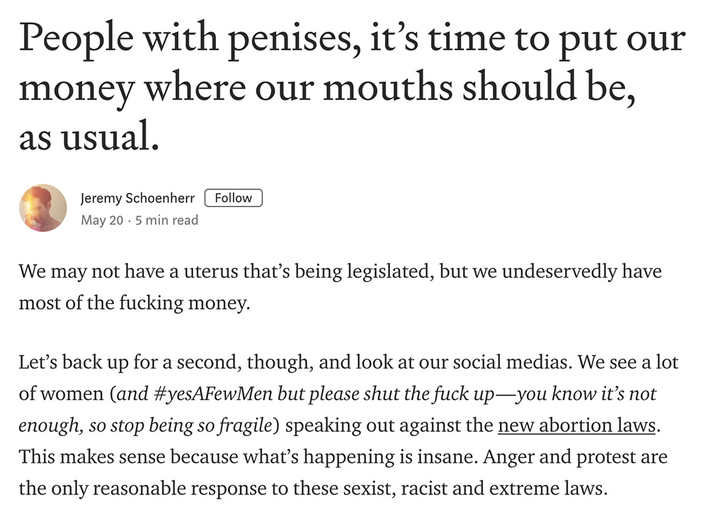 At the end of the day, taking action in ways beyond Internet engagement is the only way to make a difference. Tweeting, Instagramming, whatever is not really going to put a dent in anything. So, give money to operations like Yellowhammer Fund that helps people get the resources and transportations they need in Alabama when facing the horribly difficult decision of abortion. Schoenner lists a bunch of other spots where your money can make a difference, even if it's just a little.