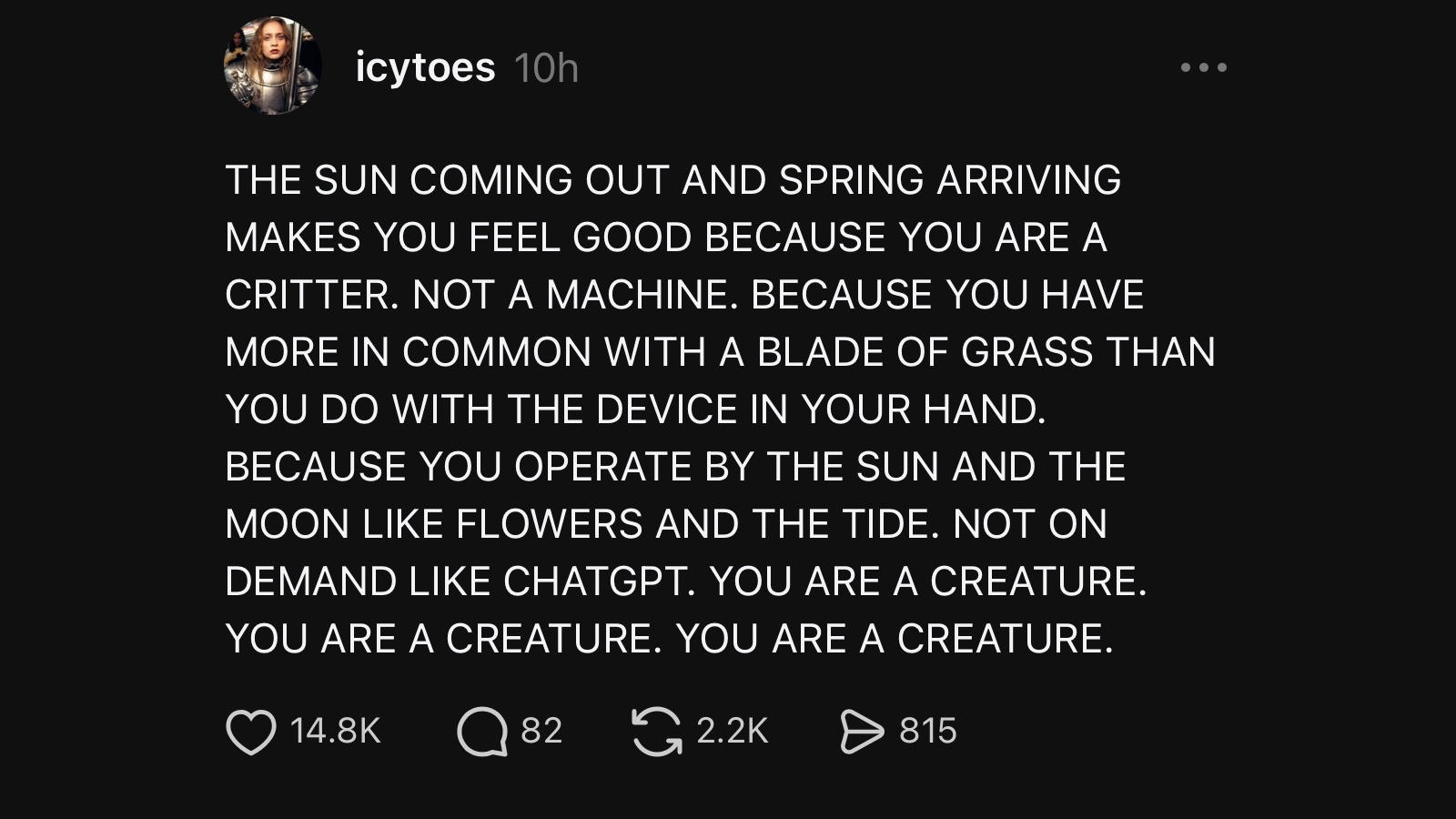 - A Good Post - you are a creature. Never forget.