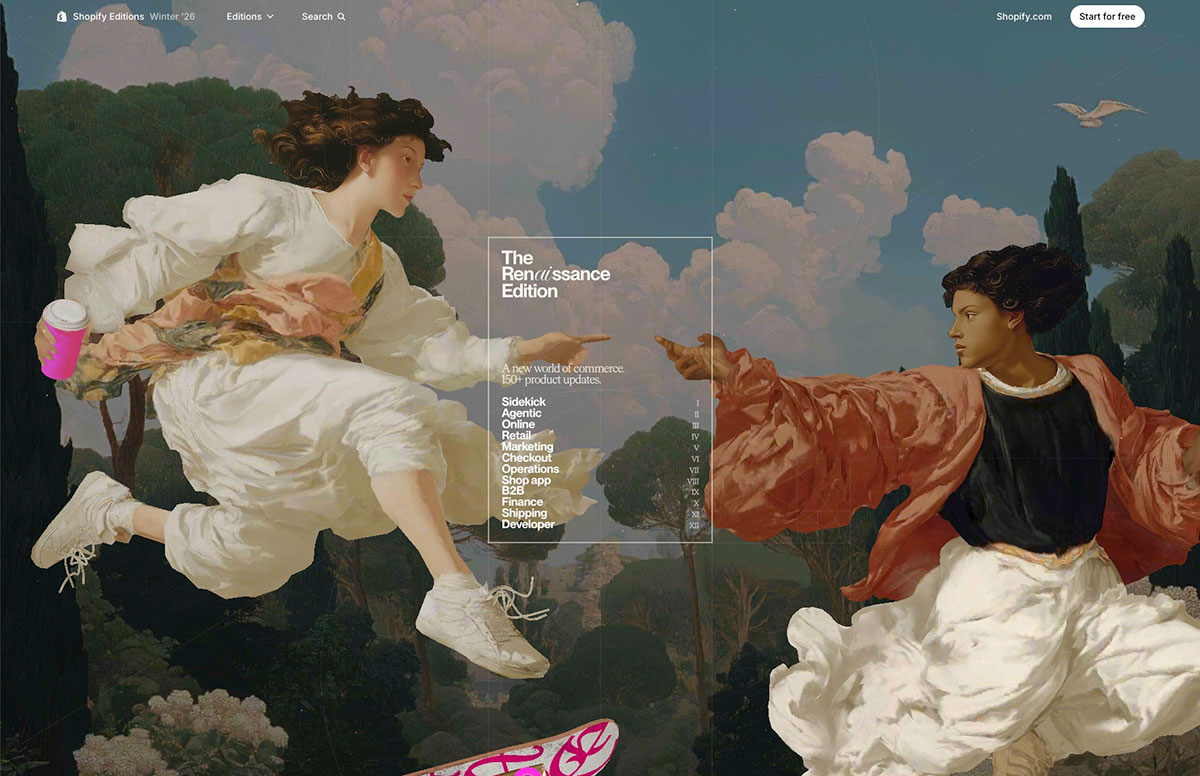 Regardless of your interest level in AI or Shopify or Shopify AI, I highly recommend you cruise over to this Shopify Editions, Winter 2026 minisite. The Renaissance inspired design is great but the site implementation is wild. The "burning paper" transition between sections is boggling my mind. The whole thing is boggling my mind and I haven't even read a single sentence on the page.