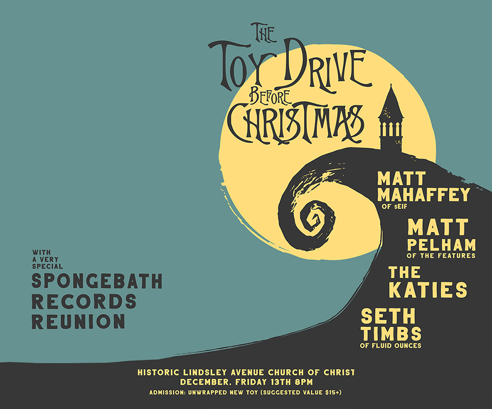 Spongebath Records fans take note: there's a mini reunion of sorts happening on Friday, December 13th here in Nashville, TN at the Lindsley Avenue Church of Christ. Why this is happening at a church is a bit beyond me but there it is! Matt Mahaffey of Self, Matt Pelham of The Features, The Katies and Seth Timbs of Fluid Ounces will be joined by a bunch of other notable names for the show which also doubles as a Toy Drive. So, if you're not revisiting some of your favorite artists from an influential time in your life and you're into doing something good for kids, you are covered.
