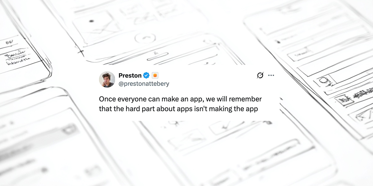 "Once everyone can make an app, we will remember that the hard part about apps isn't making the app"I'll let you go read the article (it's good) but the part that struck me the most was the bit about a Super IC, an Individual Contributor that does design, product strategy, engineering and, who knows, maybe a dash of marketing! We are living in interesting times to say the least. My gut says that burdening a designer with that many roles isn't going to result in a good end product. But the other hand says, the tooling may be nearing a point where making a proof-of-concept really isn't much effort, so why not dive in?