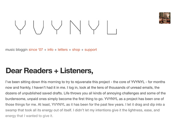 Mark over at YVYNYL recently posted a lengthy piece on his struggles maintaining the site. It's been about 3 months since his previous post and he laments that he just hasn't had the enthusiasm to keep posting. I can certainly understand his position.